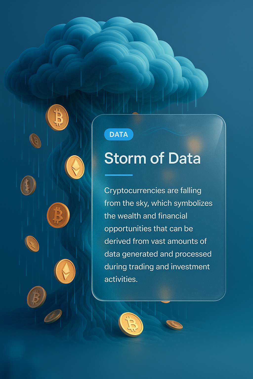 /Collection: /by davooda/Type: PNG/A 3D illustration depicting cryptocurrencies falling like rain from a cloud, symbolizing financial opportunities. The design features a transparent text block with additional graphics.