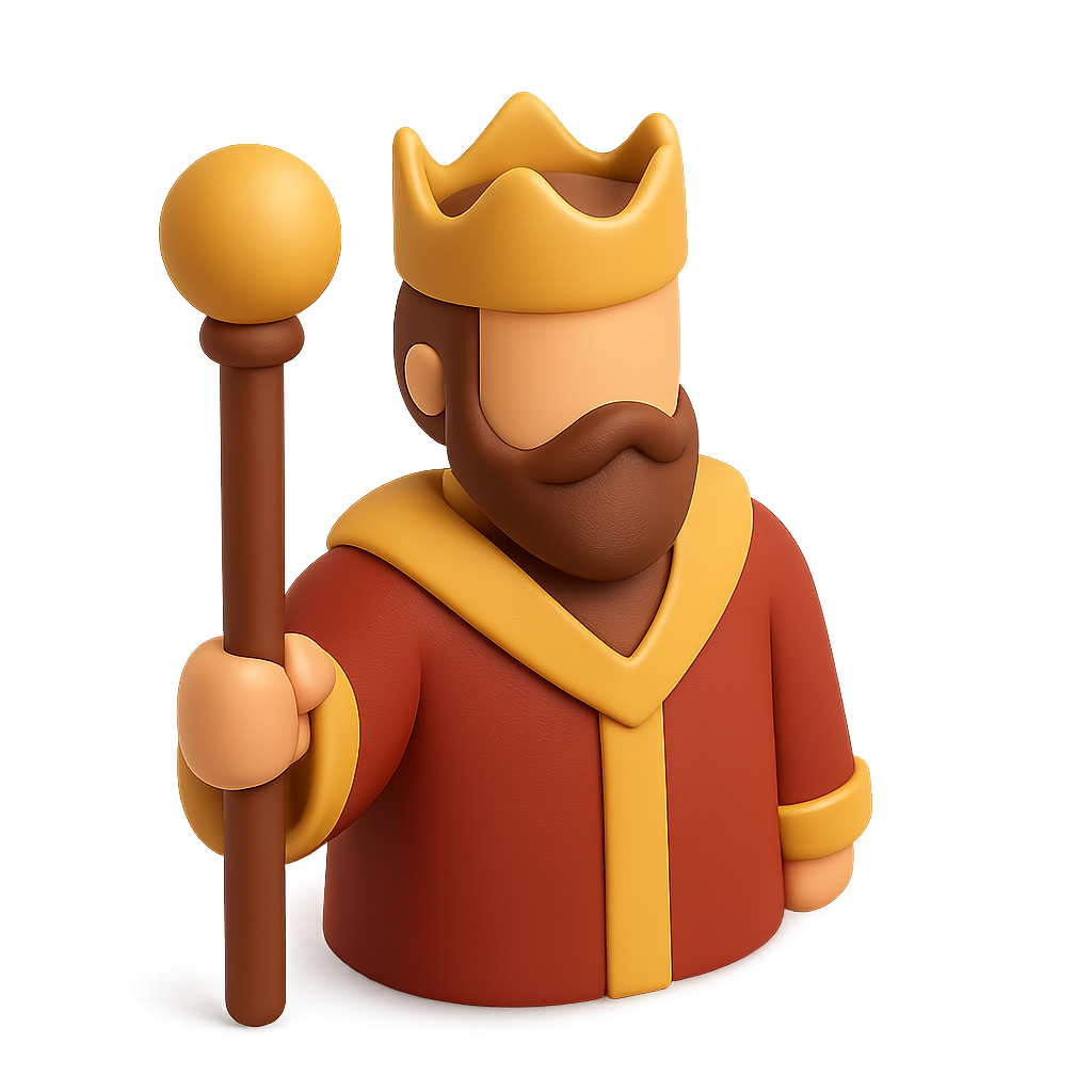 A stylized 3D icon depicting a lord holding a staff, featuring a golden crown and a red robe. The character is designed with a three-quarter view and a soft glow effect.
