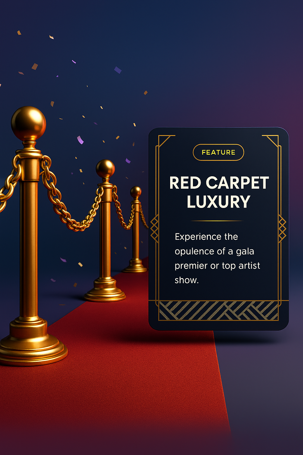A vibrant red carpet leads to a glamorous event, flanked by elegant gold chains and confetti, capturing the essence of luxury and celebration.