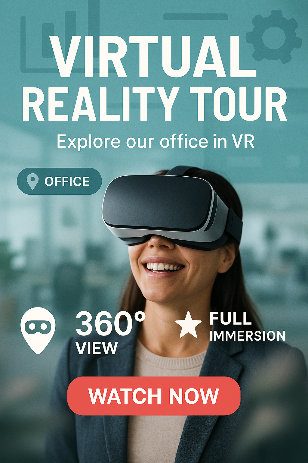 /Collection: /by davooda/Type: PNG/Engaging promotional image showcasing a virtual reality office tour. Features a smiling individual wearing a VR headset, designed to attract viewers to explore in 360°.
