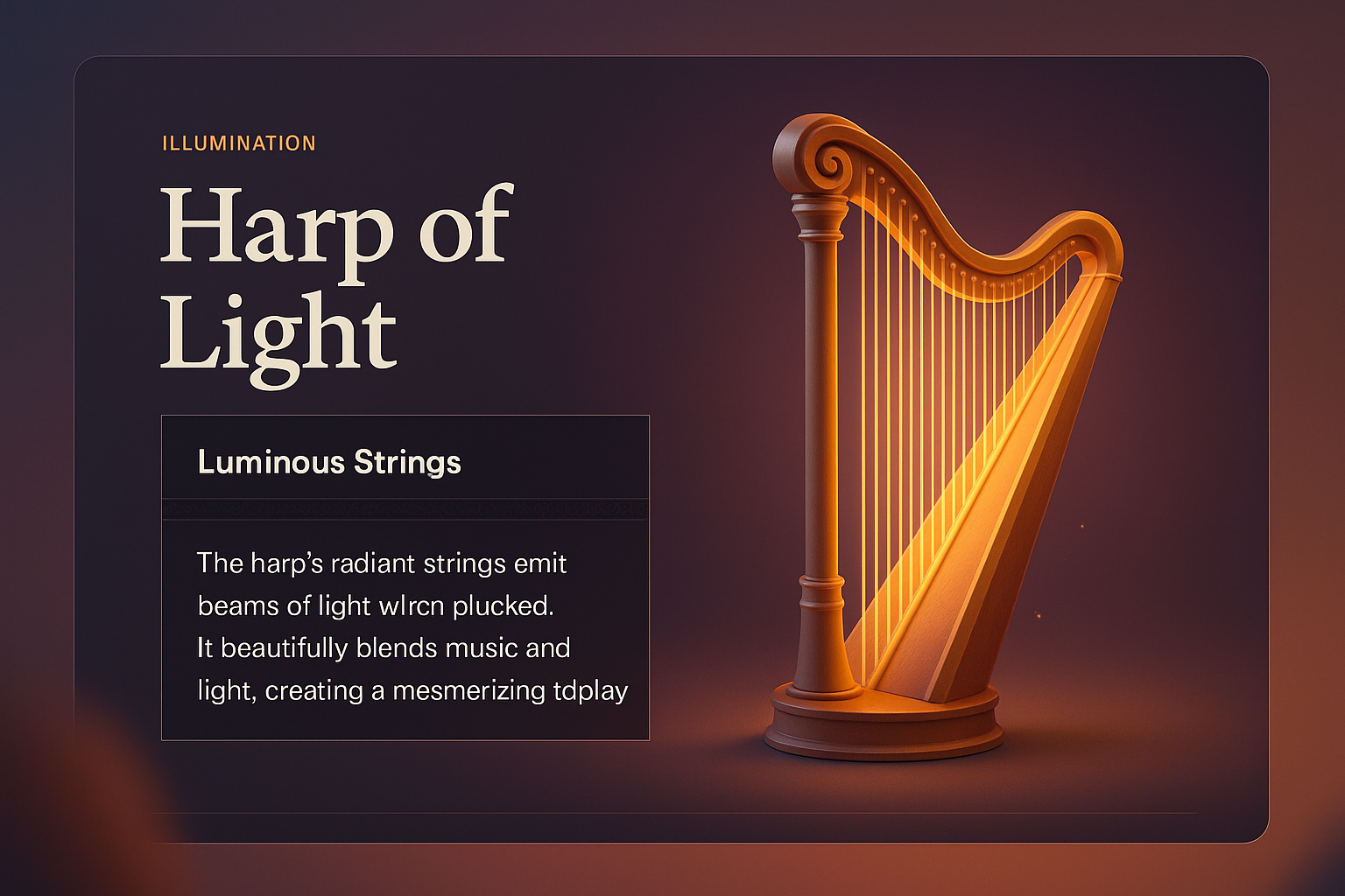 This image features a beautifully designed 3D harp with luminous strings, set against a smooth gradient background. The harp radiates light, enhancing its ethereal quality.