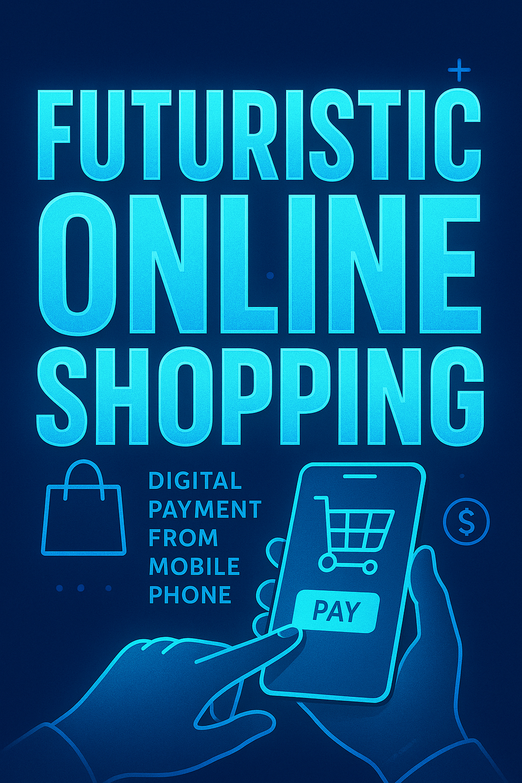 Modern digital payment graphic illustrating futuristic online shopping with a focus on mobile transactions. Ideal for e-commerce platforms and tech promotions.