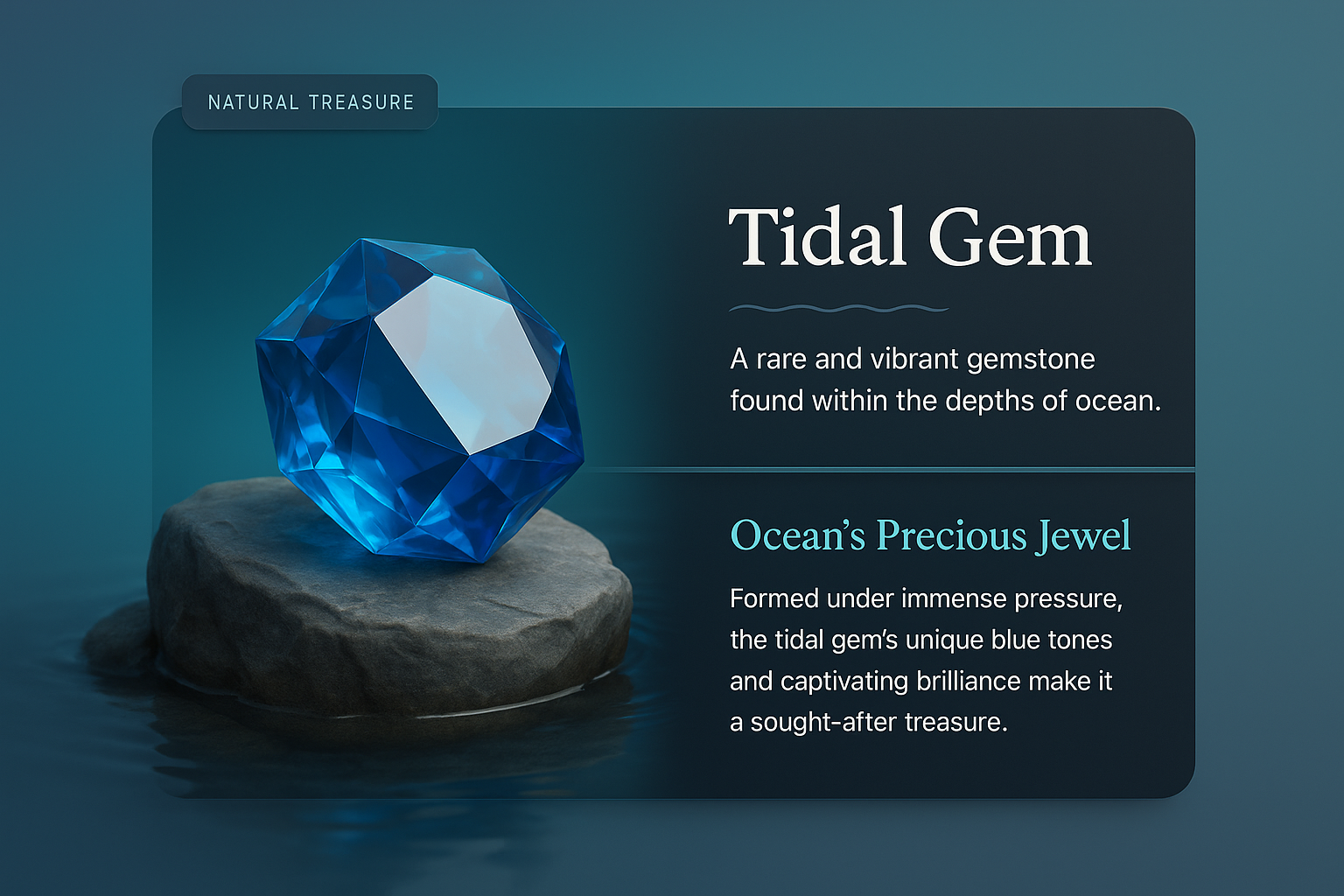 This 3D illustration showcases a vibrant tidal gem resting on a stone, integrated with text blocks and decorative patterns for a cohesive web design.