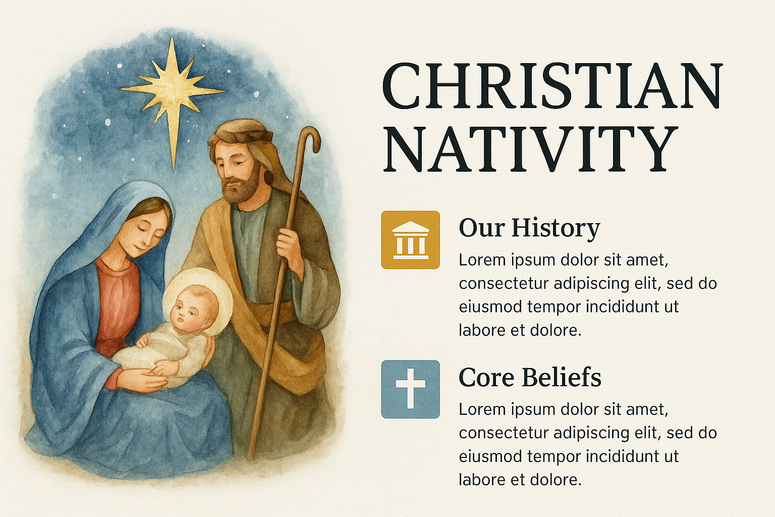 /Collection: /by davooda/Type: PNG/An illustrative depiction of the Christian Nativity featuring Mary, Joseph, and baby Jesus, accompanied by informative text sections designed for educational or promotional use.