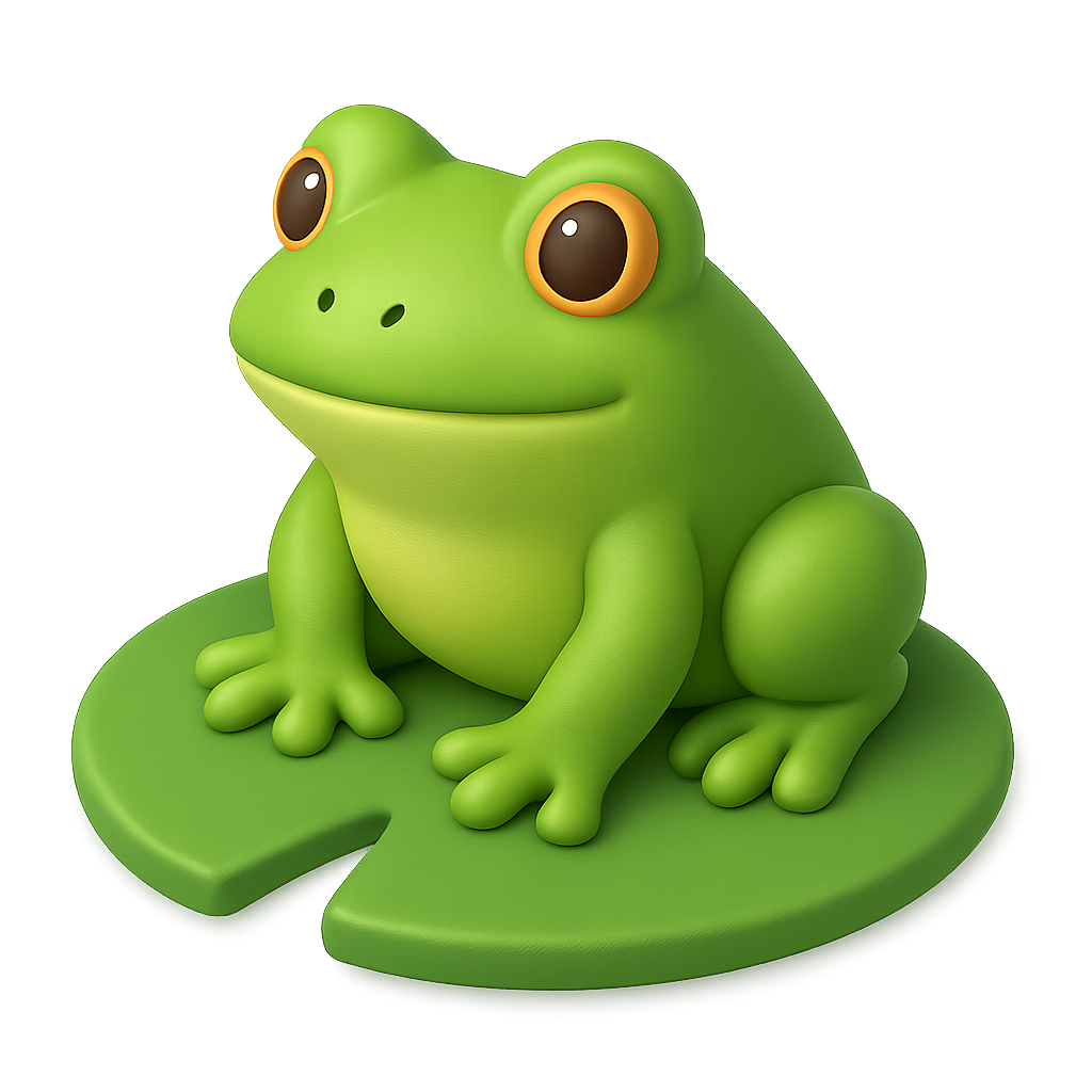 A vibrant green frog sits on a lilypad, depicted in a 3D isometric style. The frog features large eyes and a smooth texture, creating a playful and whimsical appearance.