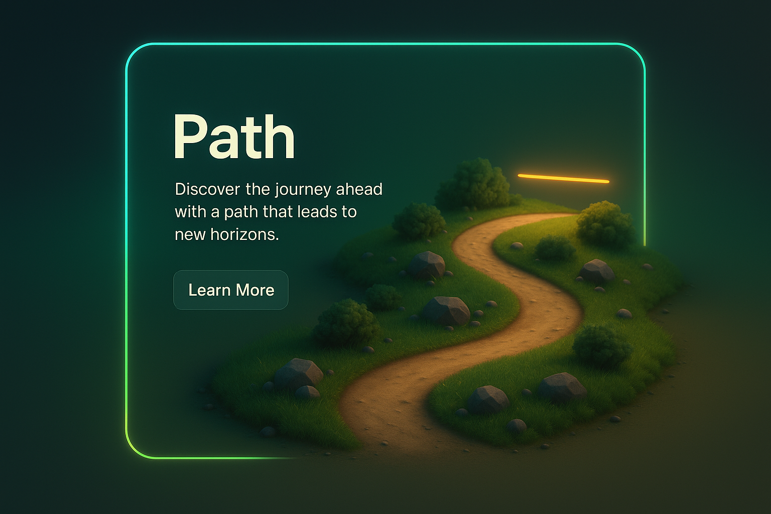 This image showcases a serene path winding through a lush environment, framed by neon accents. The scene features a gradient background, highlighting the path's journey.