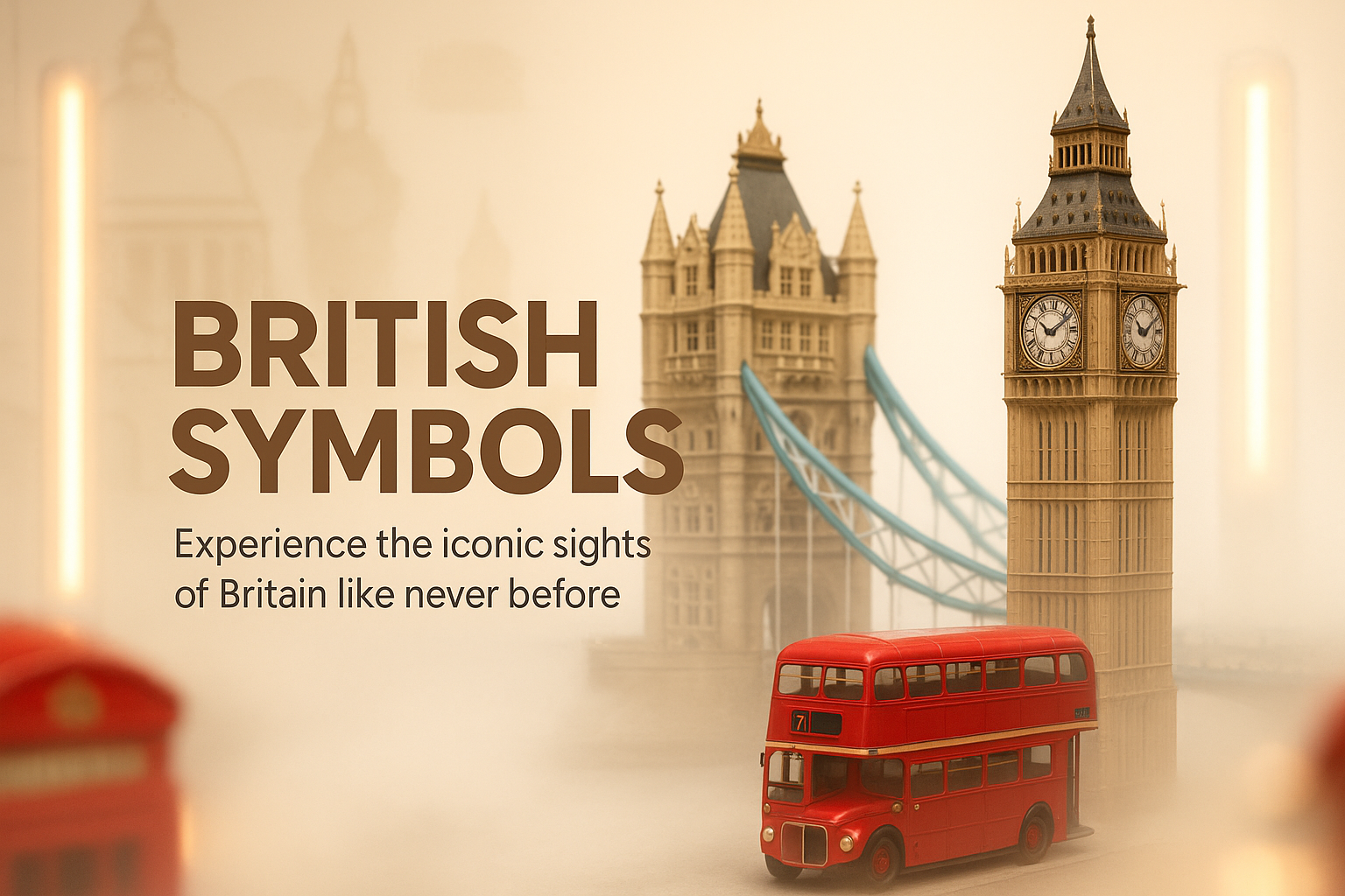 /Collection: /by davooda/Type: PNG/Visually appealing promotional image showcasing iconic British symbols, including a red double-decker bus and landmarks like Big Ben and the Tower Bridge. Ideal for tourism marketing.