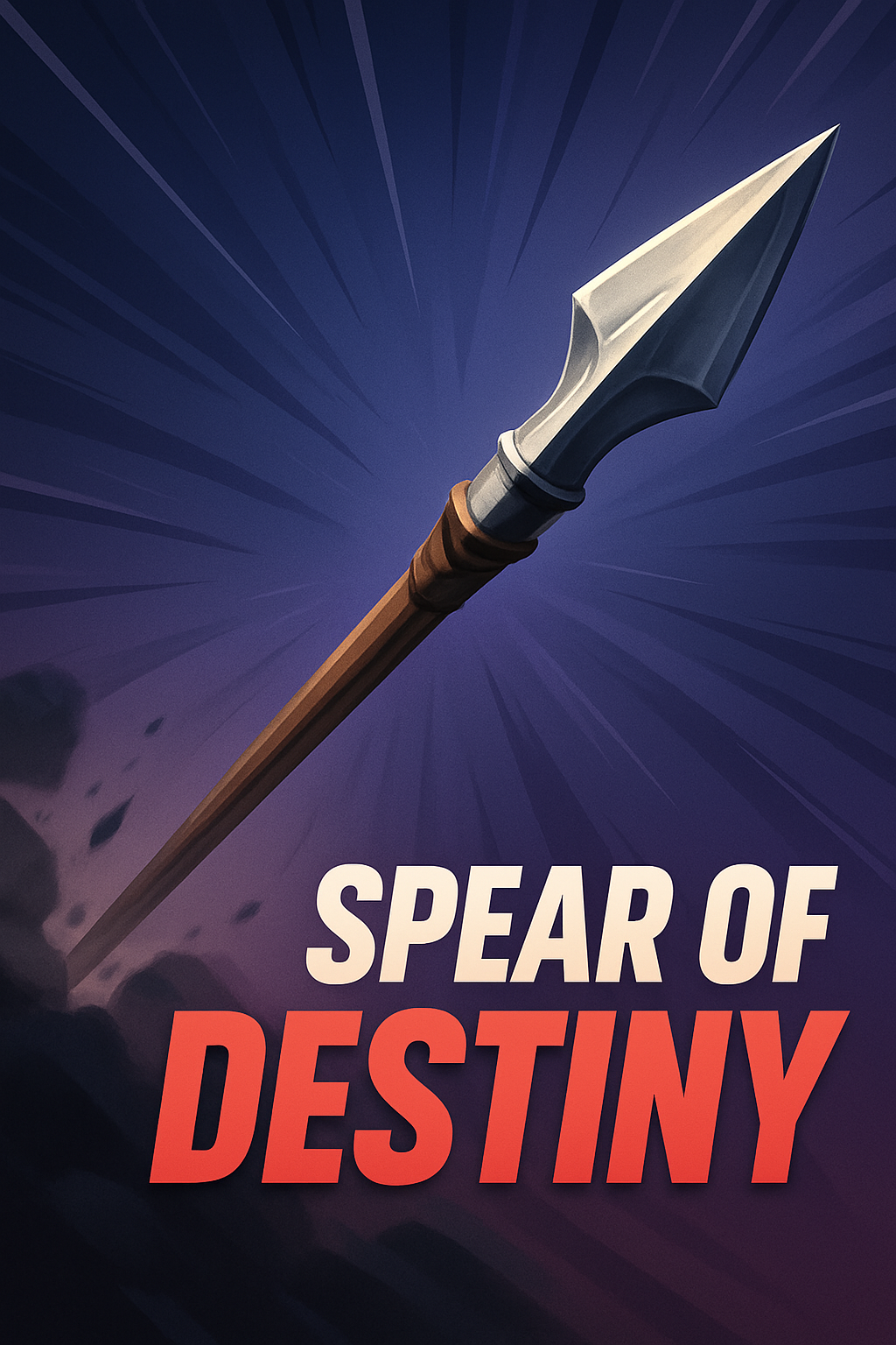 This striking image features a dynamic representation of the Spear of Destiny, set against a gradient background with rays emanating from the center, highlighting the spear's intricate design.