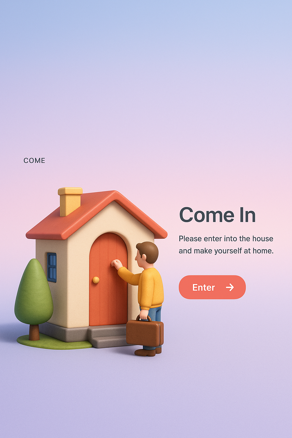 /Collection: /by davooda/Type: PNG/A realistic 3D illustration depicting a small house with a figure knocking on the door, complemented by a tree. The background features a smooth gradient transitioning from light purple to solid color.