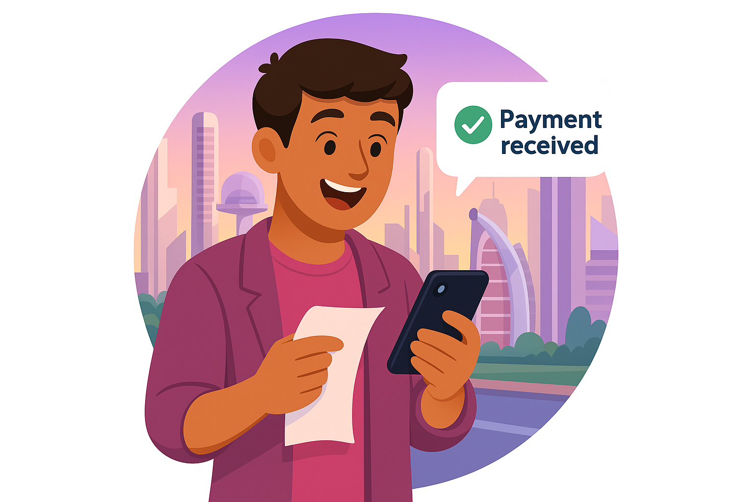 /Collection: , , /by davooda/Type: PNG/Colorful digital illustration depicting a cheerful person receiving a payment confirmation on their smartphone, set against a modern city skyline. Ideal for financial services or mobile payment apps.