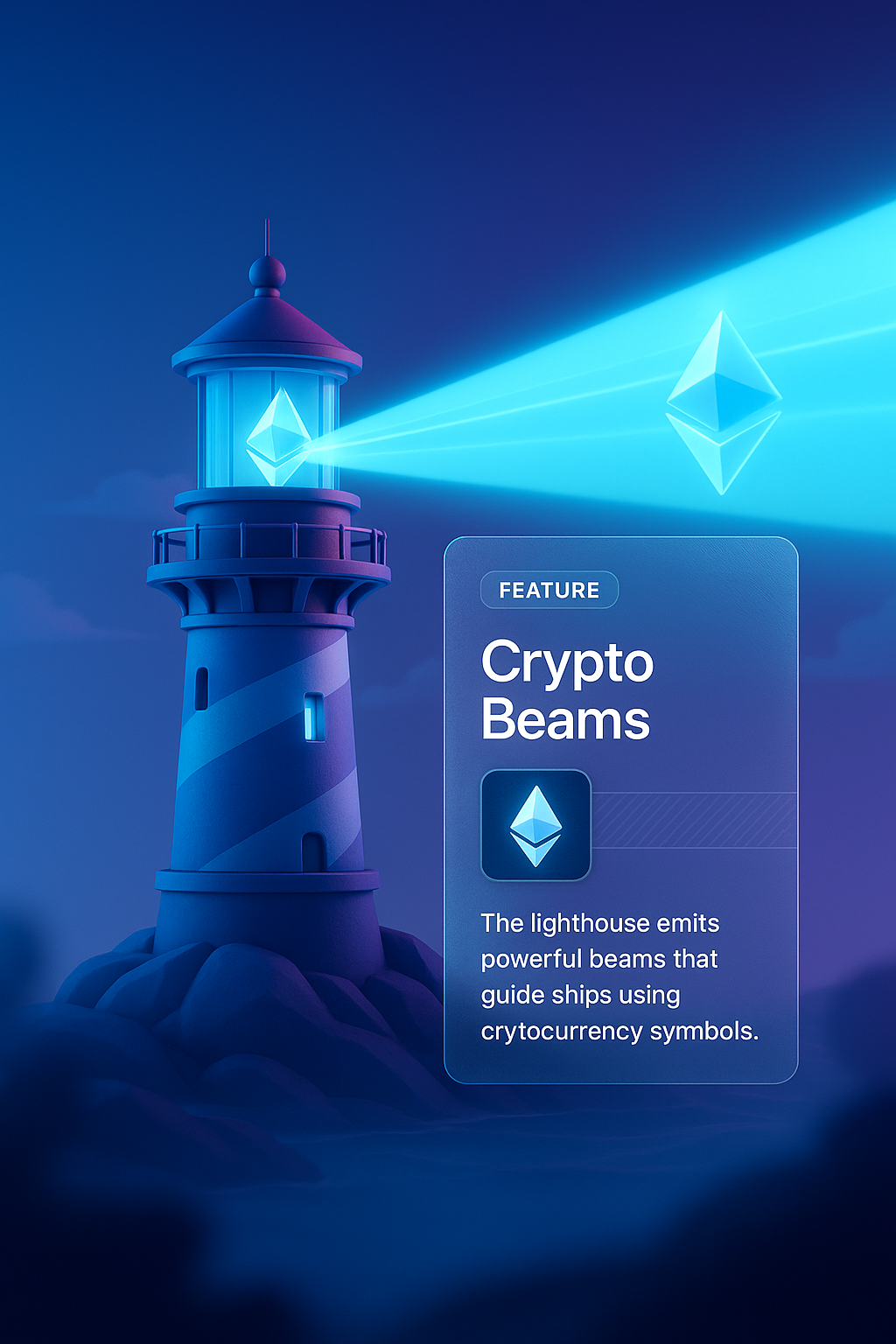 /Collection: /by davooda/Type: PNG/A stunning 3D illustration of a futuristic lighthouse emitting vibrant crypto beams. The design features a gradient background and integrated feature block highlighting the lighthouse's capabilities.
