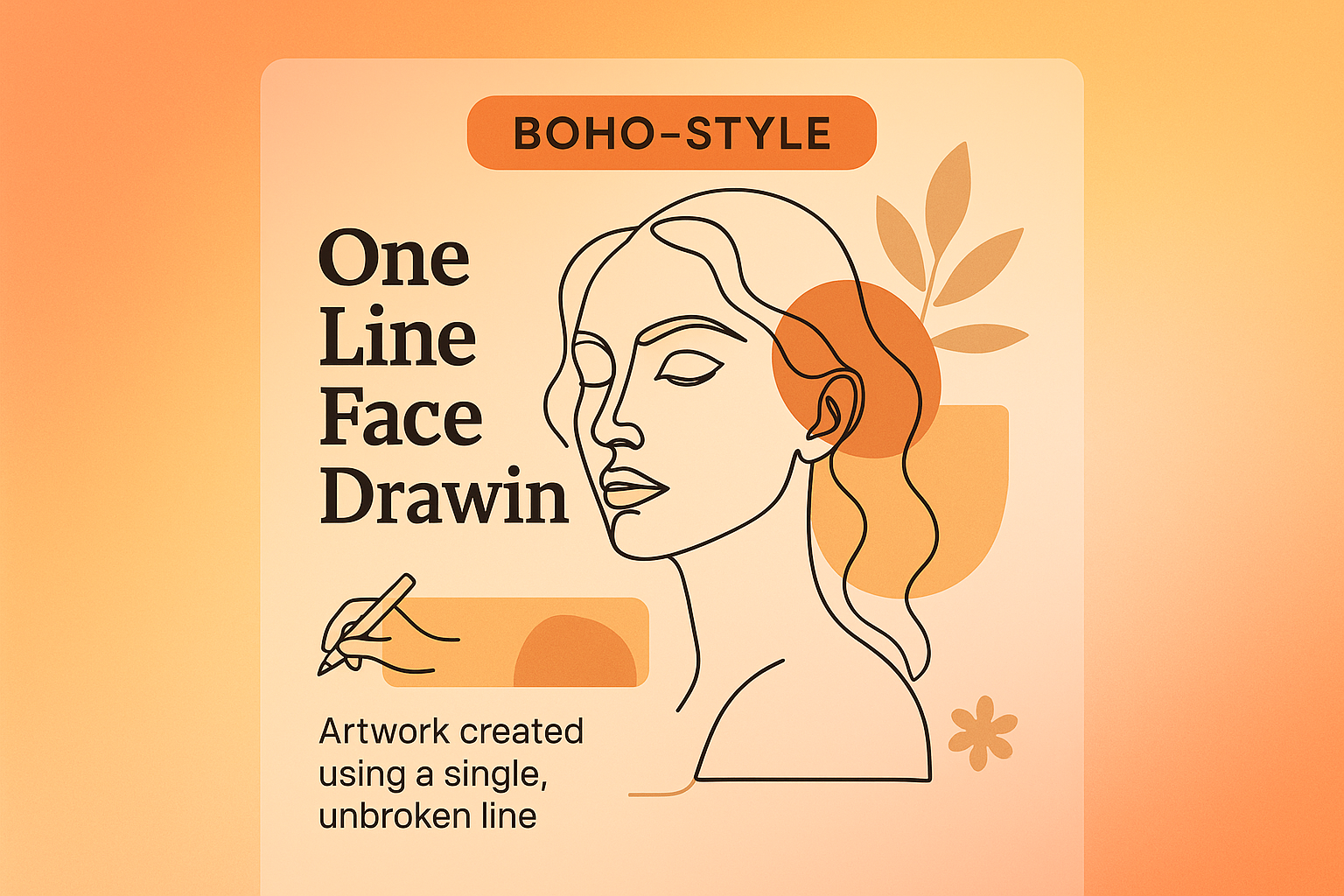This graphic represents a boho-style illustration of a woman's face created with a single unbroken line. It's ideal for art enthusiasts and social media sharing.