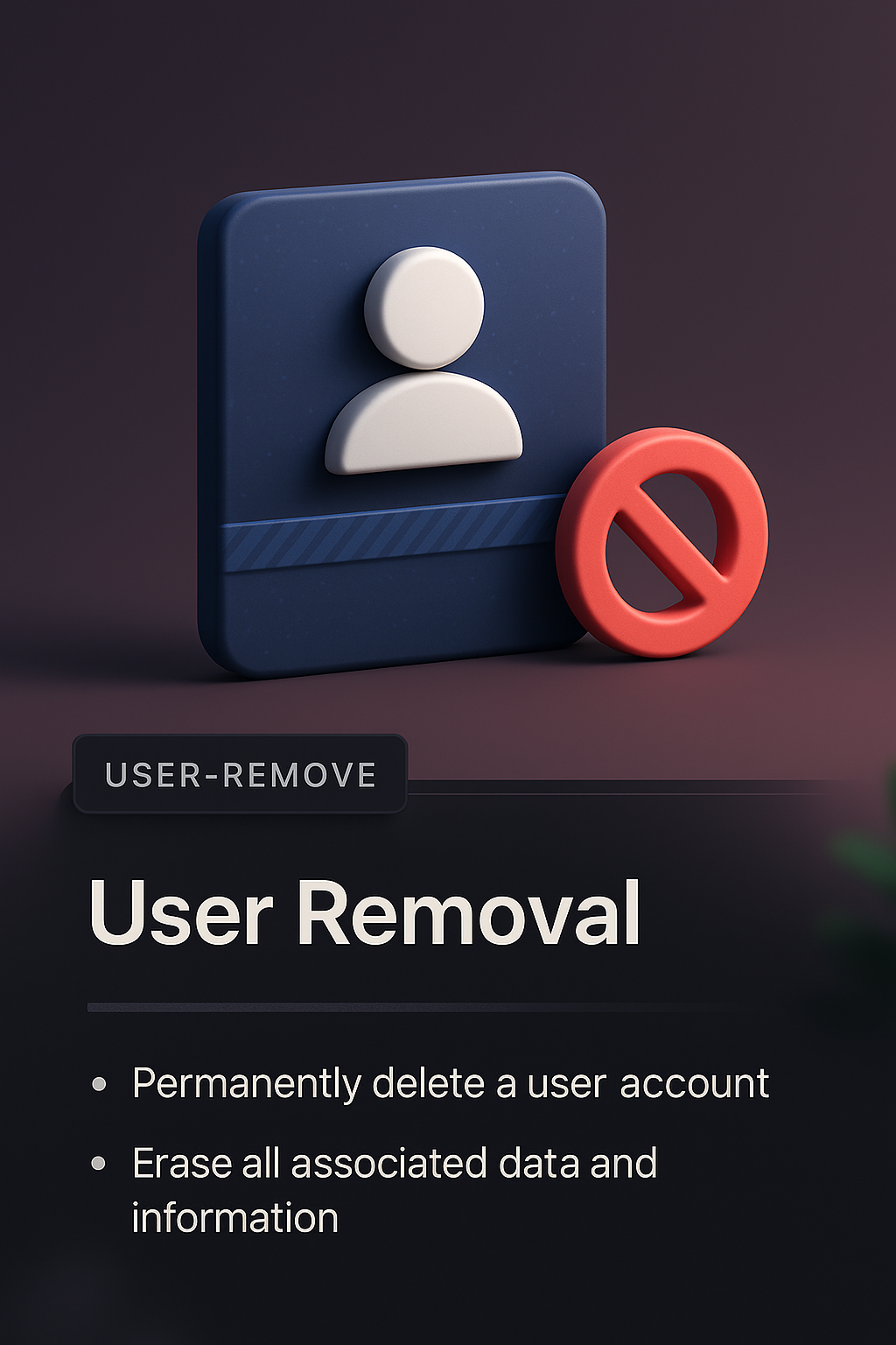A 3D illustration depicting user account removal with a dark-themed badge and a prohibition symbol. Features concise text blocks outlining key actions.