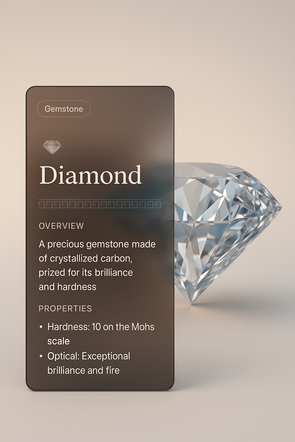 /Collection: /by davooda/Type: PNG/A stunning 3D rendering of a diamond, accompanied by a sleek overlay providing details about its properties and characteristics, set against a smooth gradient background.