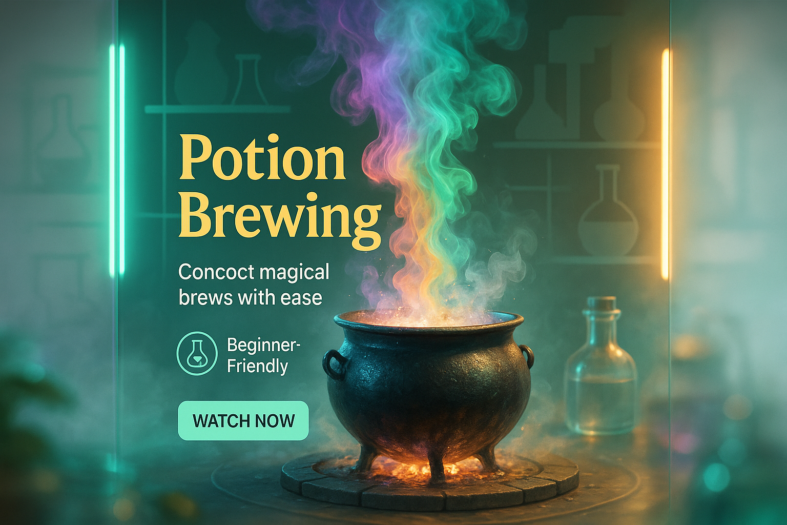 Vibrant promotional graphic showcasing a bubbling cauldron with colorful smoke, ideal for engaging users in a beginner-friendly potion brewing experience.