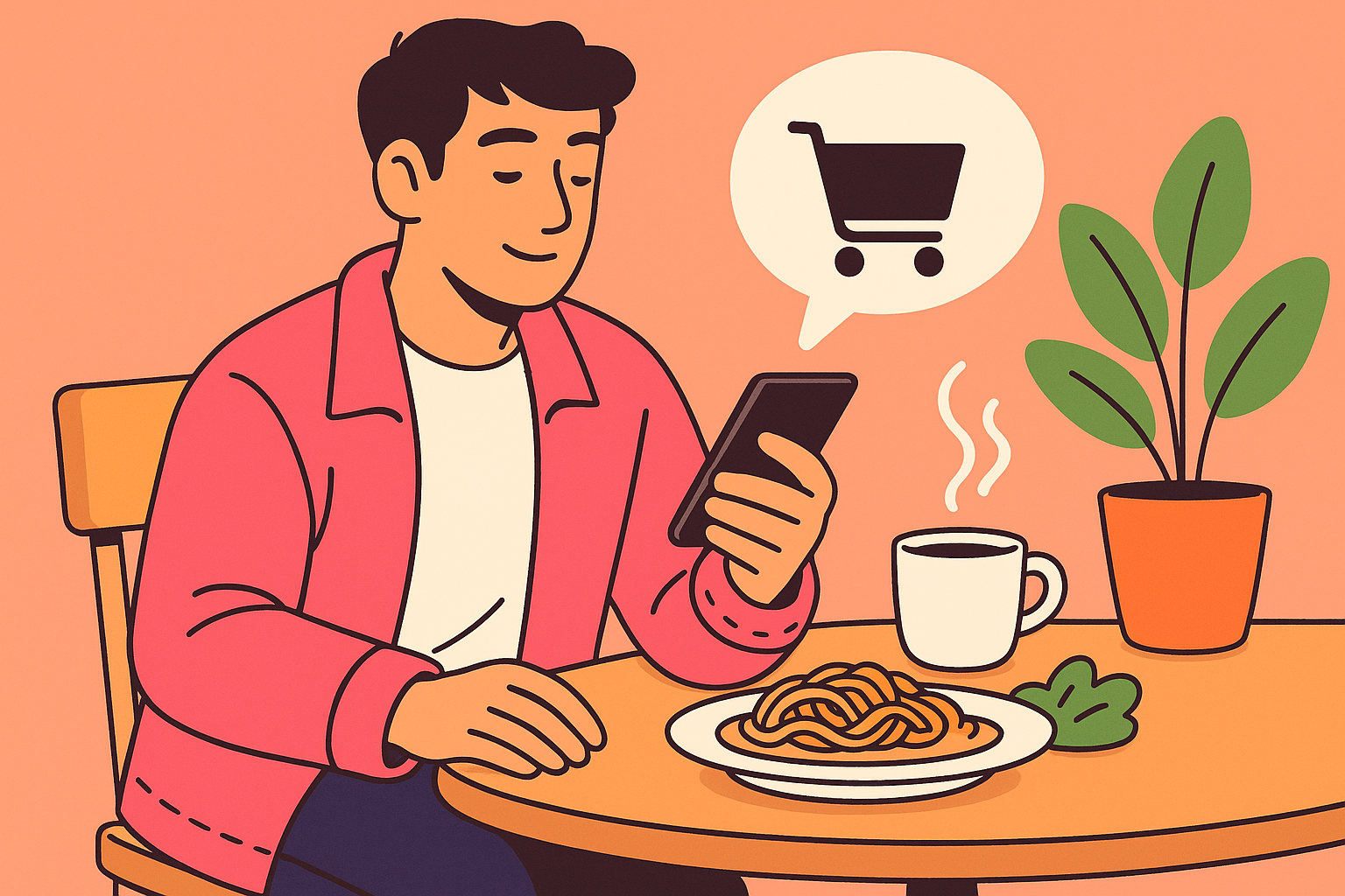 Vibrant digital illustration depicting a young man using a smartphone to order food, surrounded by a cozy dining setup with a plate of pasta and a coffee cup, ideal for food delivery apps or lifestyle blogs.