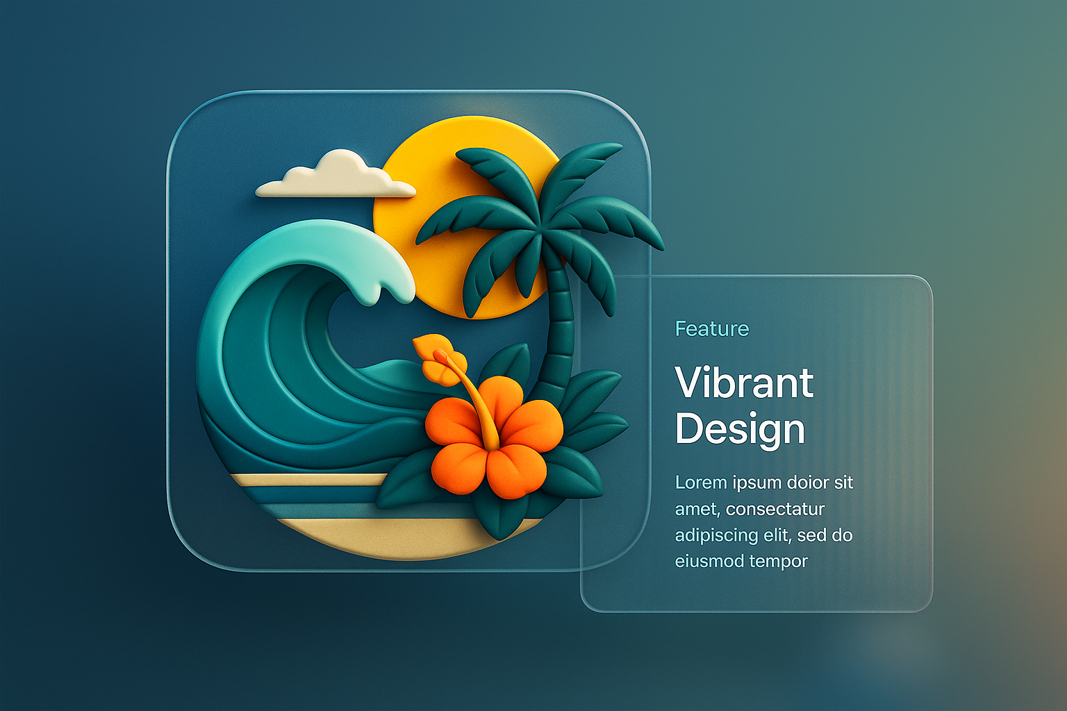 /Collection: /by davooda/Type: PNG/A colorful 3D illustration depicting a palm tree, waves, and a flower, embodying summer vibes. The design features a modern aesthetic with layered elements and a gradient background.