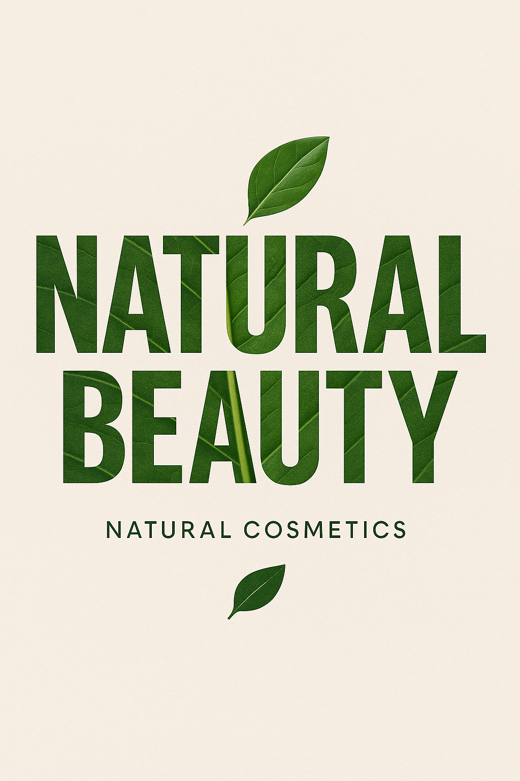 Stylish promotional graphic for natural cosmetics featuring bold typography and leaf motifs. Ideal for eco-friendly beauty brands and marketing materials.