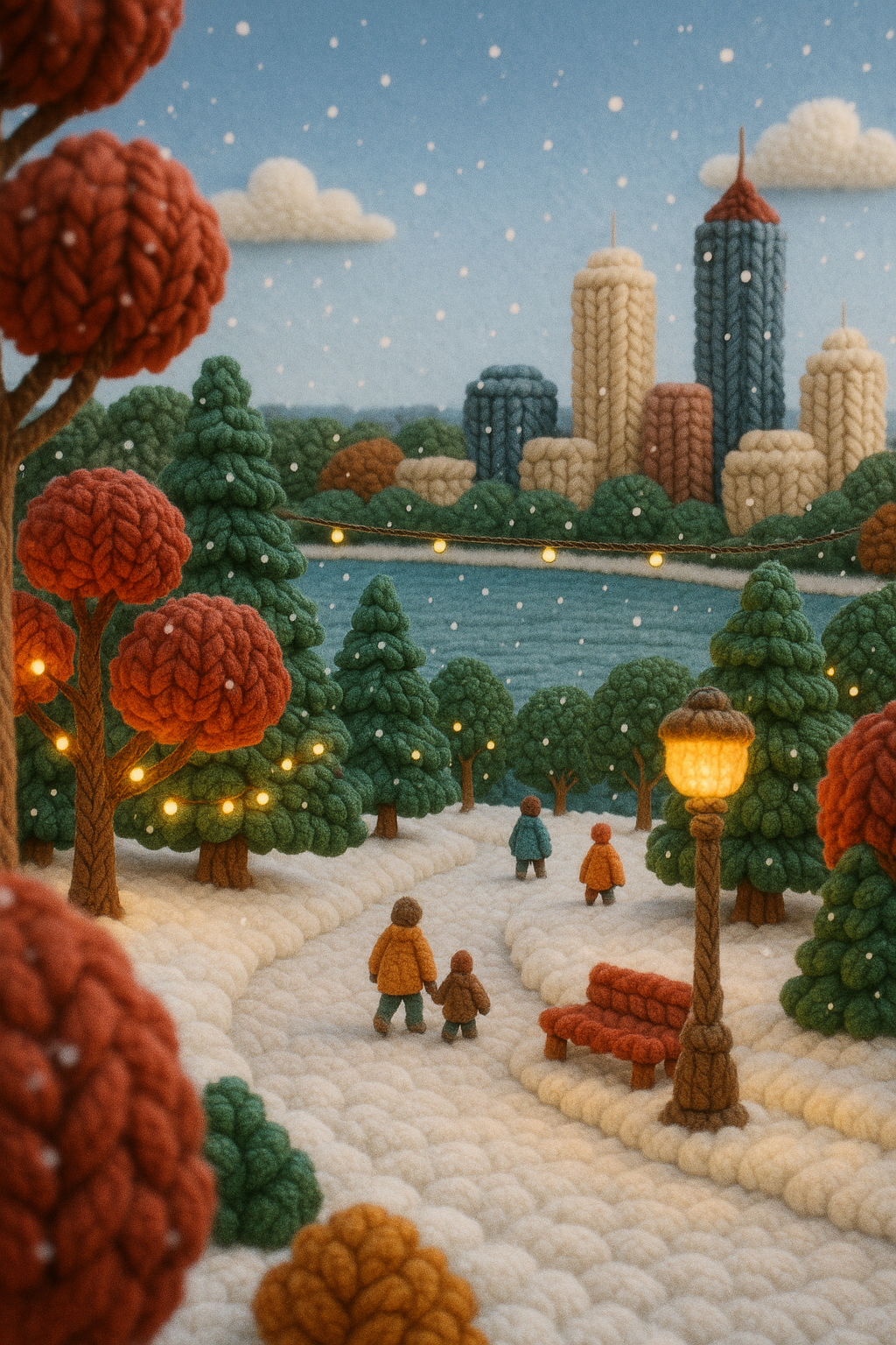 A cozy winter scene in Kings Park featuring plush trees and buildings made of thick yarn. Snow gently falls as small figures stroll along a winding path, illuminated by soft lights.