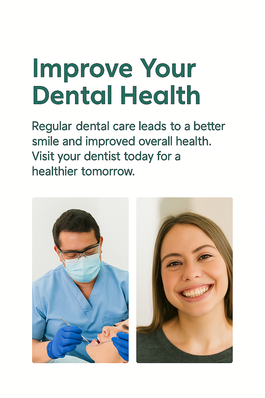 Informative social media graphic promoting dental health with images of a dentist and a smiling patient. Ideal for health campaigns and dental practices.