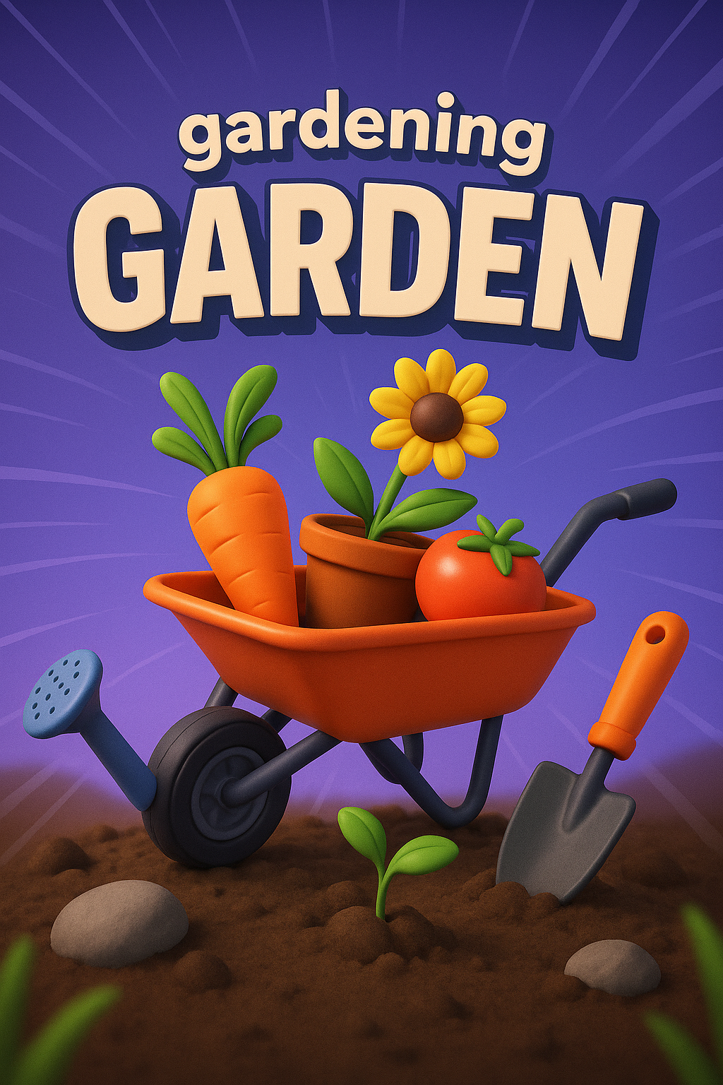 A lively garden scene showcasing a wheelbarrow filled with plants, carrots, and a sunflower, against a vibrant gradient background, creating a sense of motion.