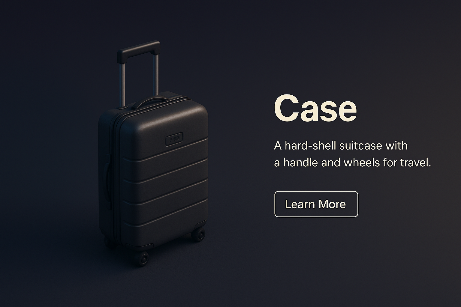 /Collection: /by davooda/Type: PNG/A realistic 3D scene featuring a black hard-shell suitcase with wheels and a handle. Accompanied by a simple text block and a call-to-action button, set against a dark gradient background.