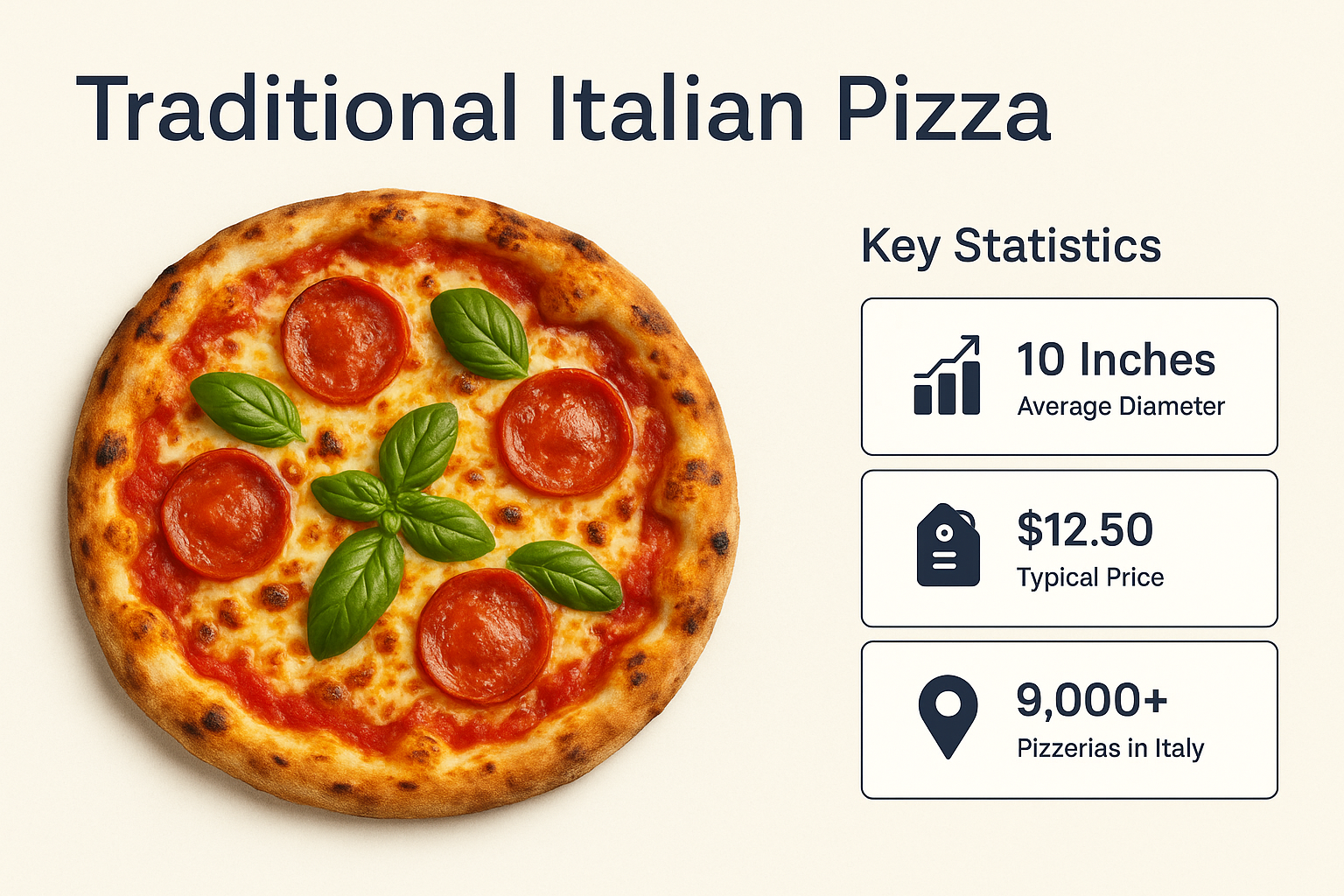 A visually appealing infographic showcasing key statistics about traditional Italian pizza, perfect for culinary blogs or food-related content.
