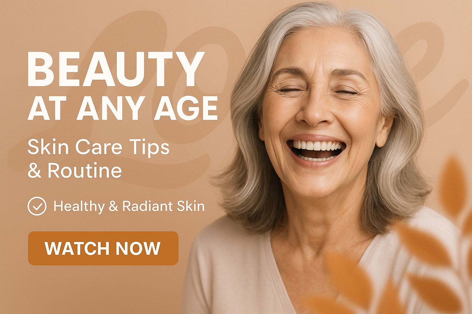 /Collection: /by davooda/Type: PNG/Engaging promotional graphic showcasing skin care tips for all ages, featuring a smiling woman and soft pastel colors, ideal for social media and wellness campaigns.