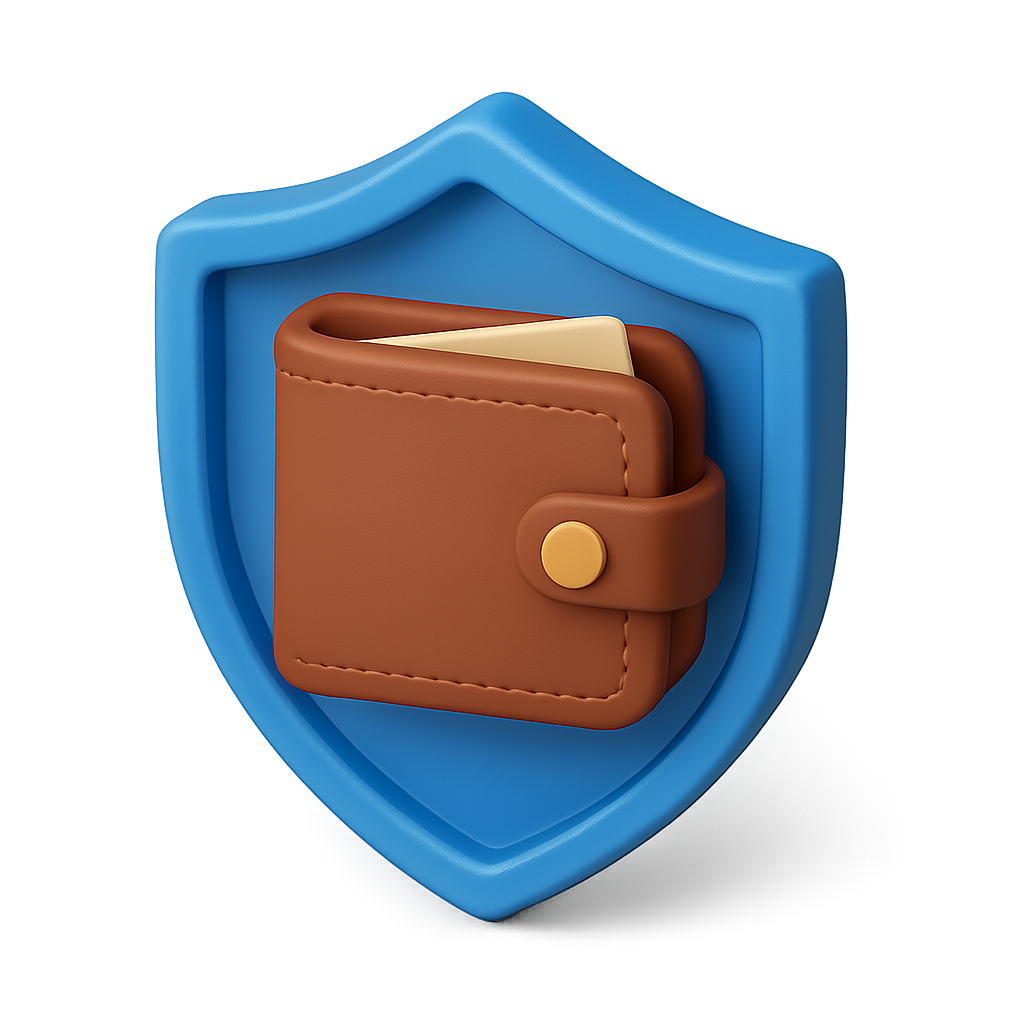 A visually striking 3D icon featuring a brown wallet nested within a blue shield. The design showcases a three-quarter view, emphasizing depth and a modern isometric style.
