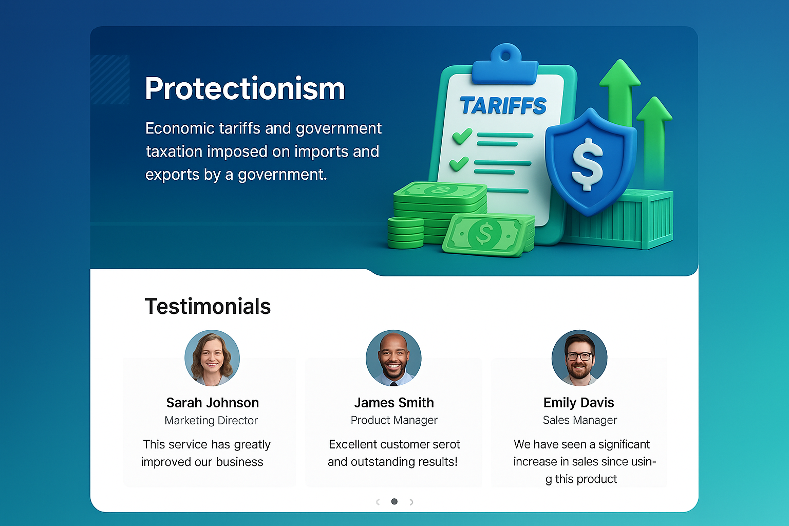 /Collection: /by davooda/Type: PNG/A vibrant 3D illustration depicting economic tariffs and government taxation, featuring a clipboard, money stacks, and a shield symbol, along with a testimonials section.