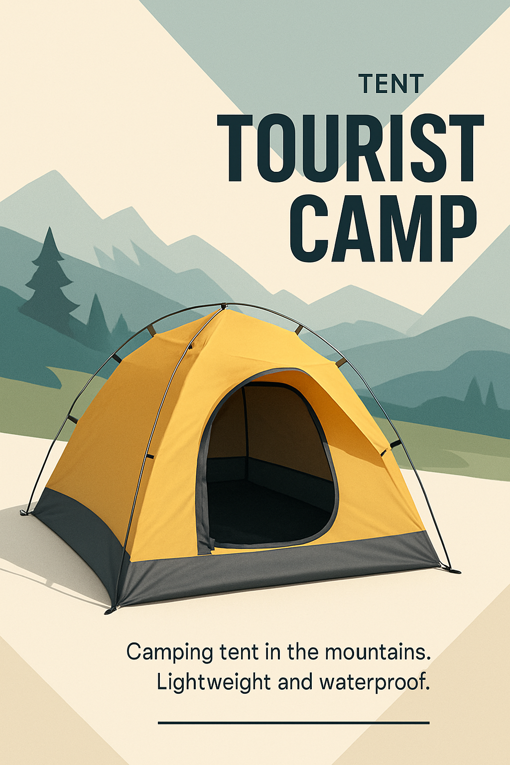 A modern advertisement featuring a yellow camping tent set in a picturesque mountain landscape. The design includes contrasting light color fields and bold typography for an eye-catching effect.