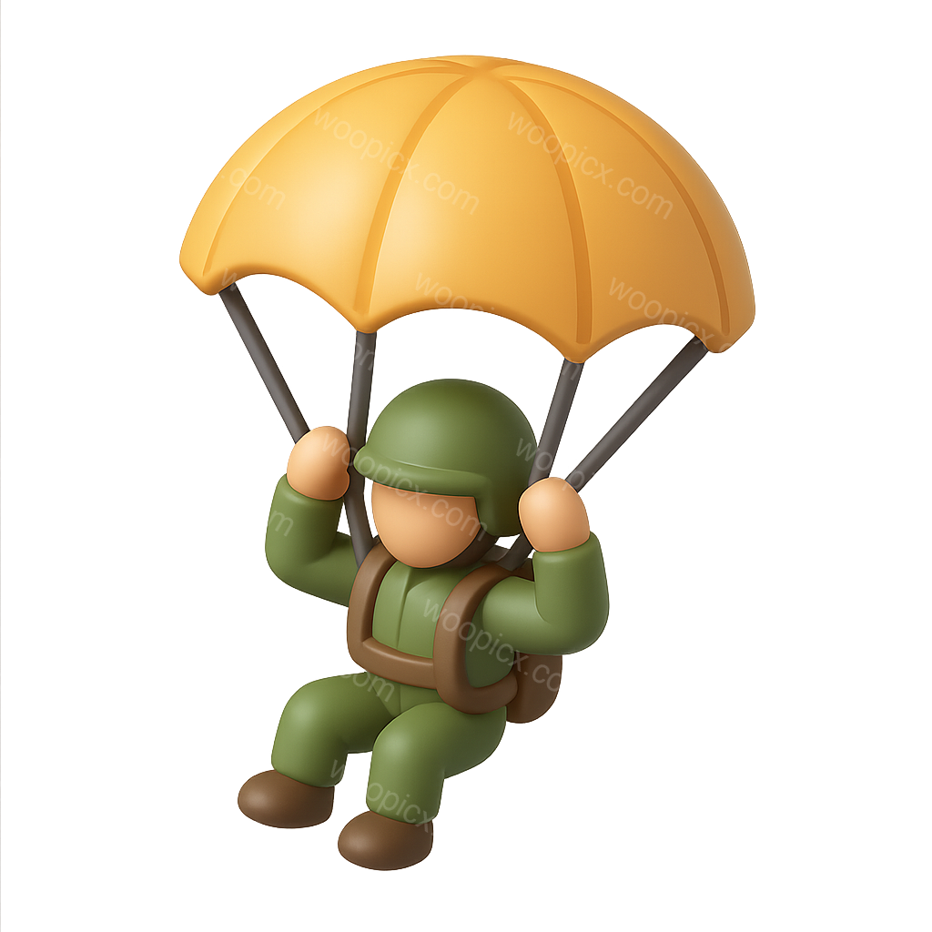 /Premium/Collection: /by davooda/Type: PNG/A stylized 3D icon of a paratrooper descending with a yellow parachute. The figure is dressed in green military attire, showcasing a three-quarter view with a volumetric effect.