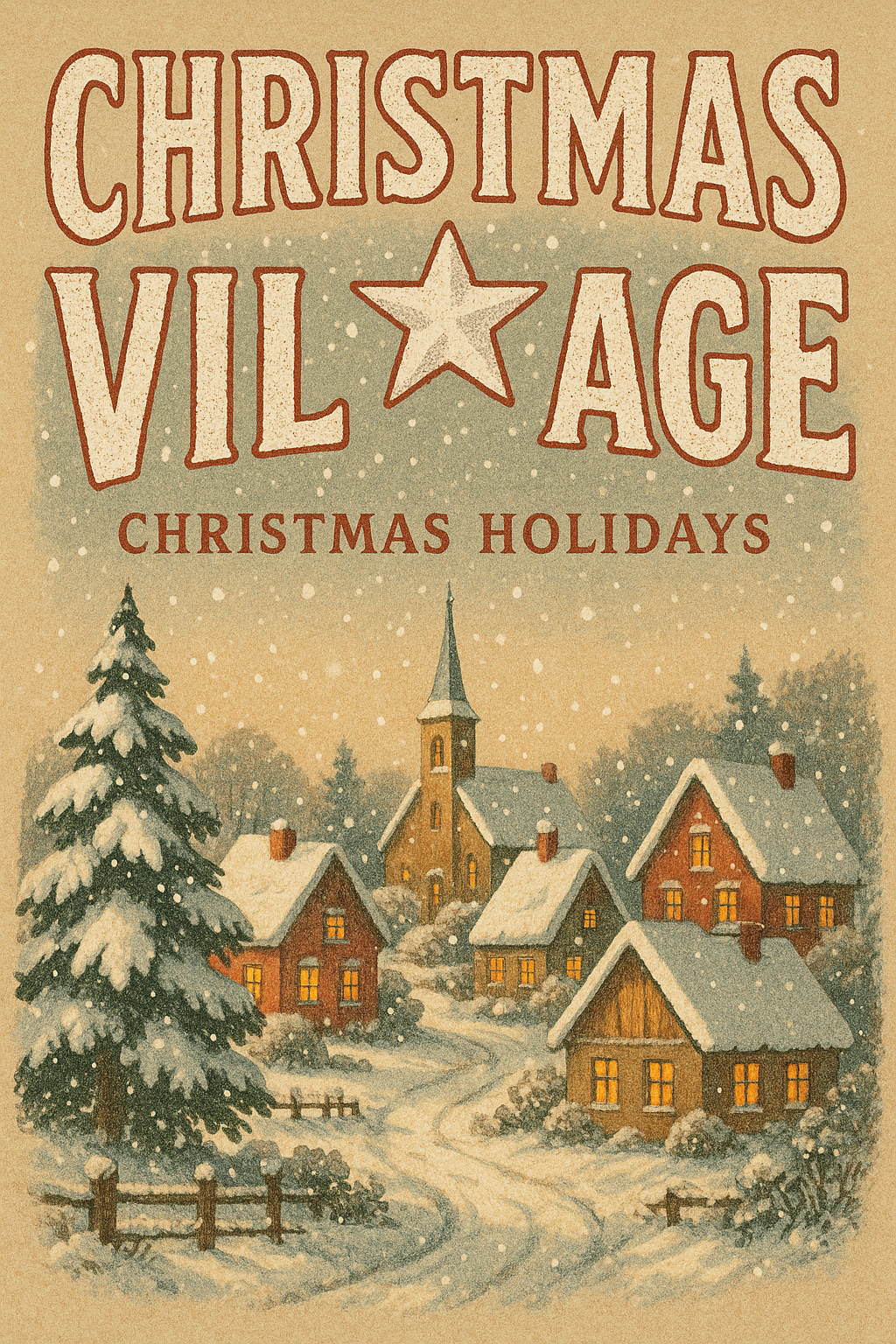 Charming vintage illustration depicting a snowy Christmas village scene, ideal for holiday-themed projects or seasonal decorations.