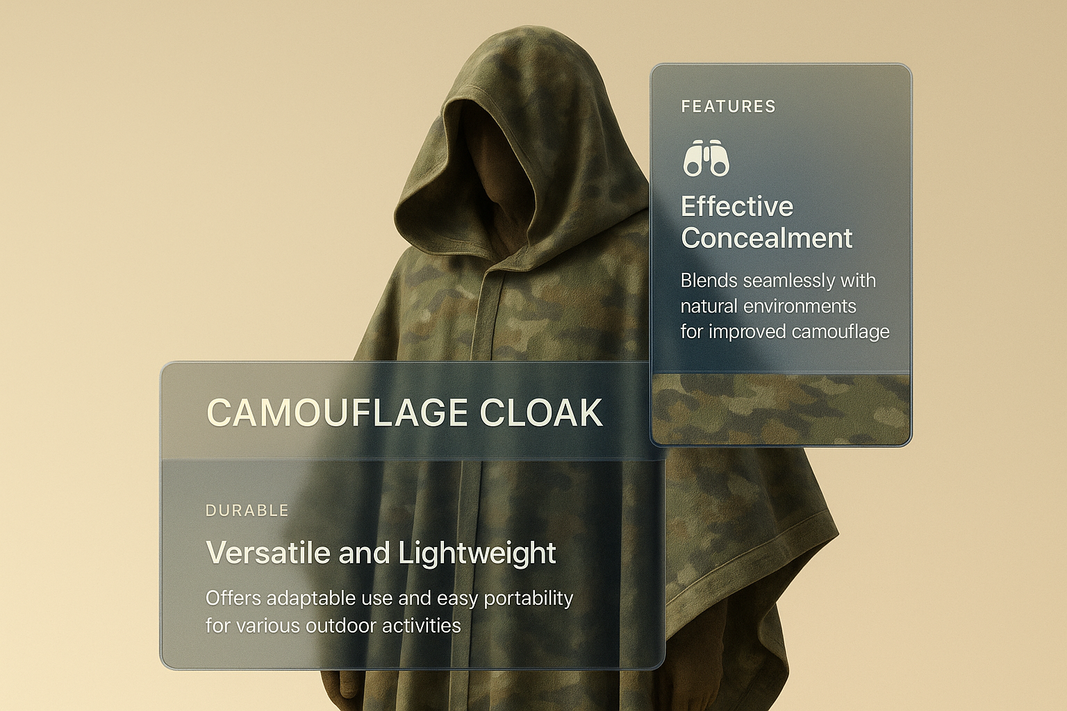 A 3D illustration of a camouflage cloak against a smooth gradient background. Features highlighted on transparent panels emphasize its versatility and effective concealment for outdoor activities.