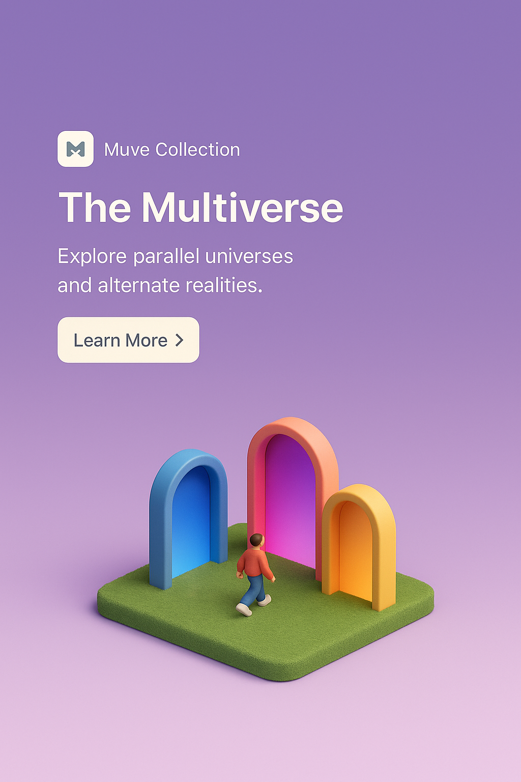 A captivating 3D scene illustrating a character interacting with colorful arches in a stylized landscape, showcasing the concept of parallel universes.