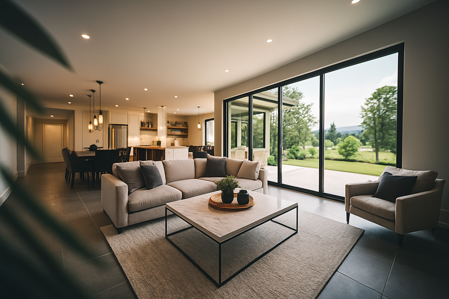 A spacious and stylish living room featuring an open floor plan that connects to a modern kitchen and dining area. Large windows offer stunning views of the outdoors.