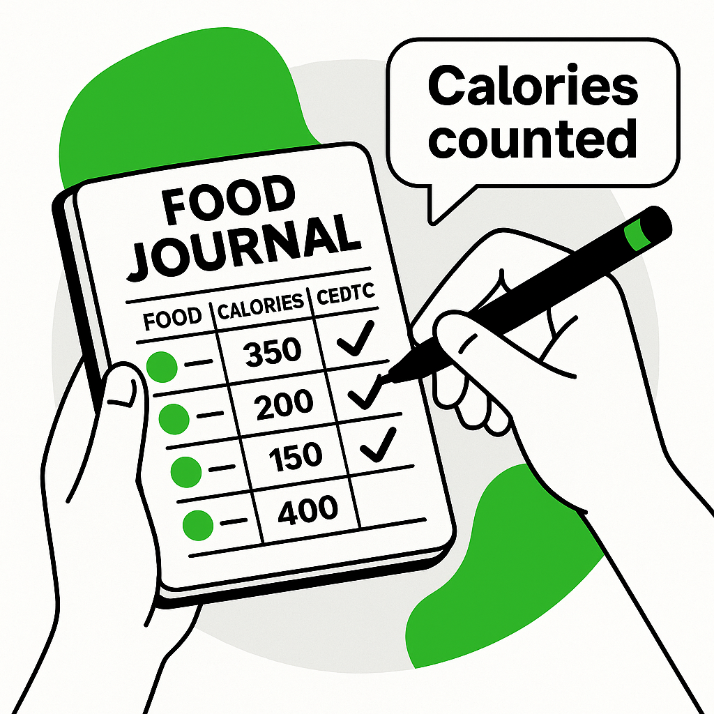 /Collection: /by davooda/Type: PNG/An illustrative graphic showing a hand writing in a food journal, emphasizing calorie counting. Ideal for health and fitness content aimed at individuals tracking their diet.