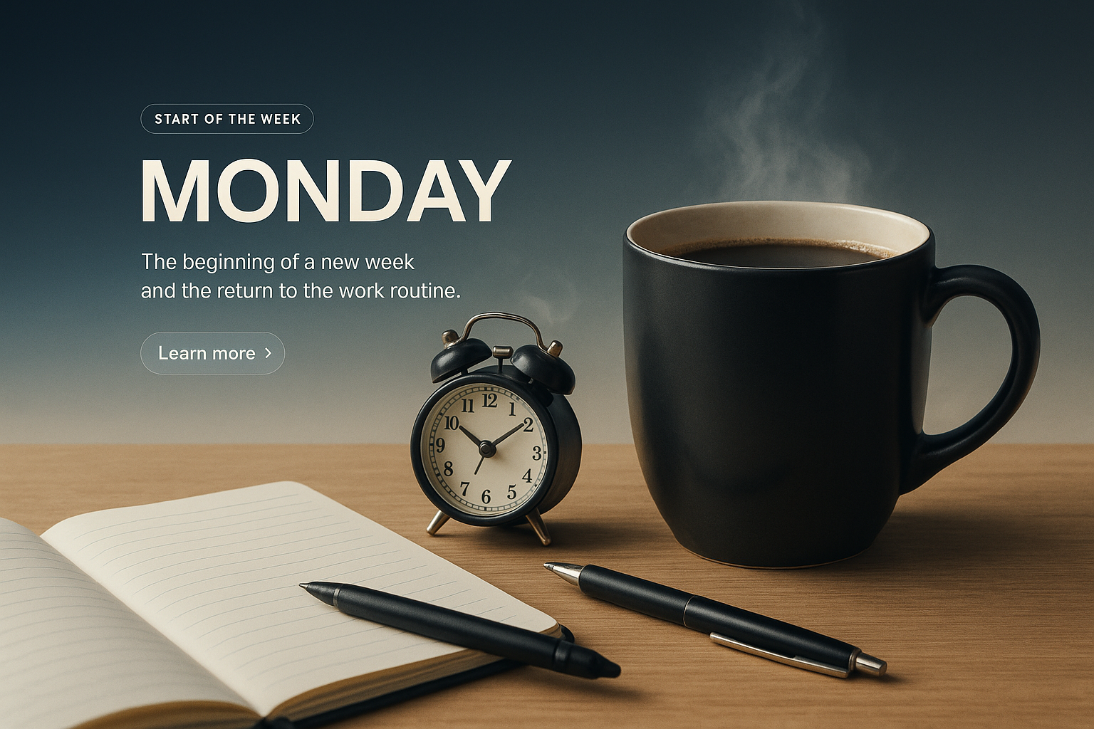 A stylish web page design featuring a coffee cup, clock, and notebook. The layout promotes Monday motivation with a clean design and easy-to-read text.