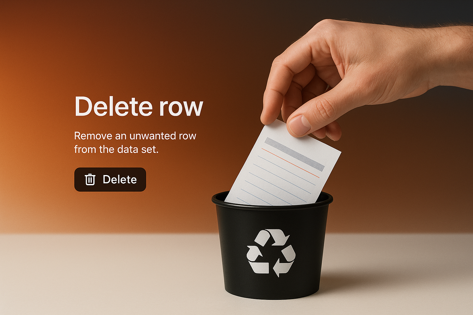 A hand is dropping a note into a black recycling bin, symbolizing the action of deleting a data row. The background features a gradient from dark to light, enhancing the visual appeal.