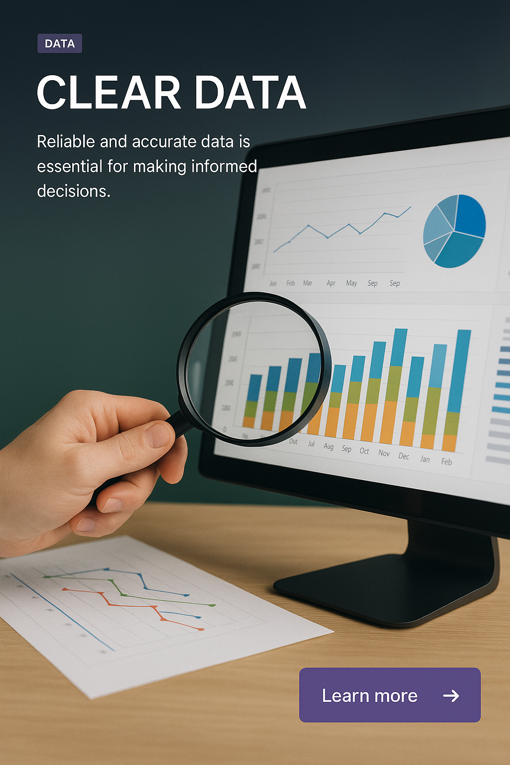 A visually appealing web page layout featuring data analysis. It includes a hand holding a magnifying glass over charts, with a clear call-to-action button.