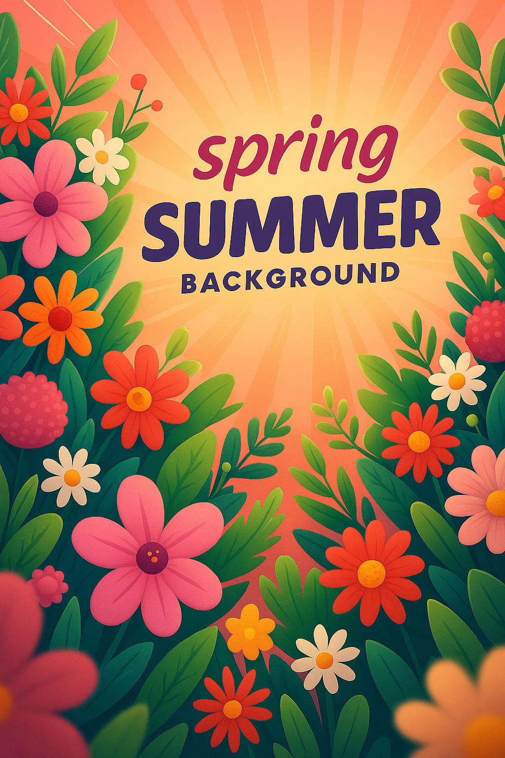 A colorful pattern of flowers and foliage creates a dynamic spring and summer background. The design features vibrant hues, layered composition, and engaging typography.