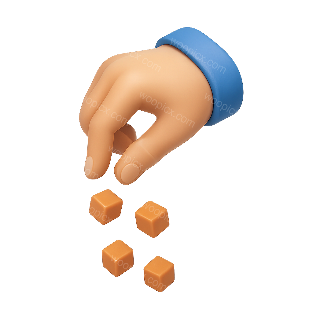 A 3D icon depicting a hand in a three-quarter view, releasing small orange cubes. The design features a smooth, volumetric effect with a transparent background.