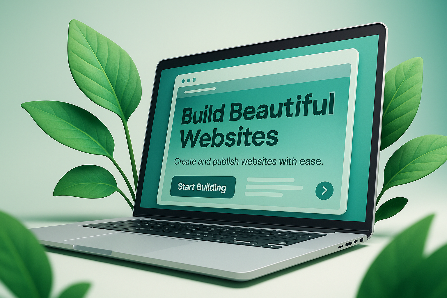 /Collection: /by davooda/Type: PNG/A sleek laptop displaying the text 'Build Beautiful Websites' surrounded by lush green leaves. The design features a smooth gradient background, enhancing the visual appeal.