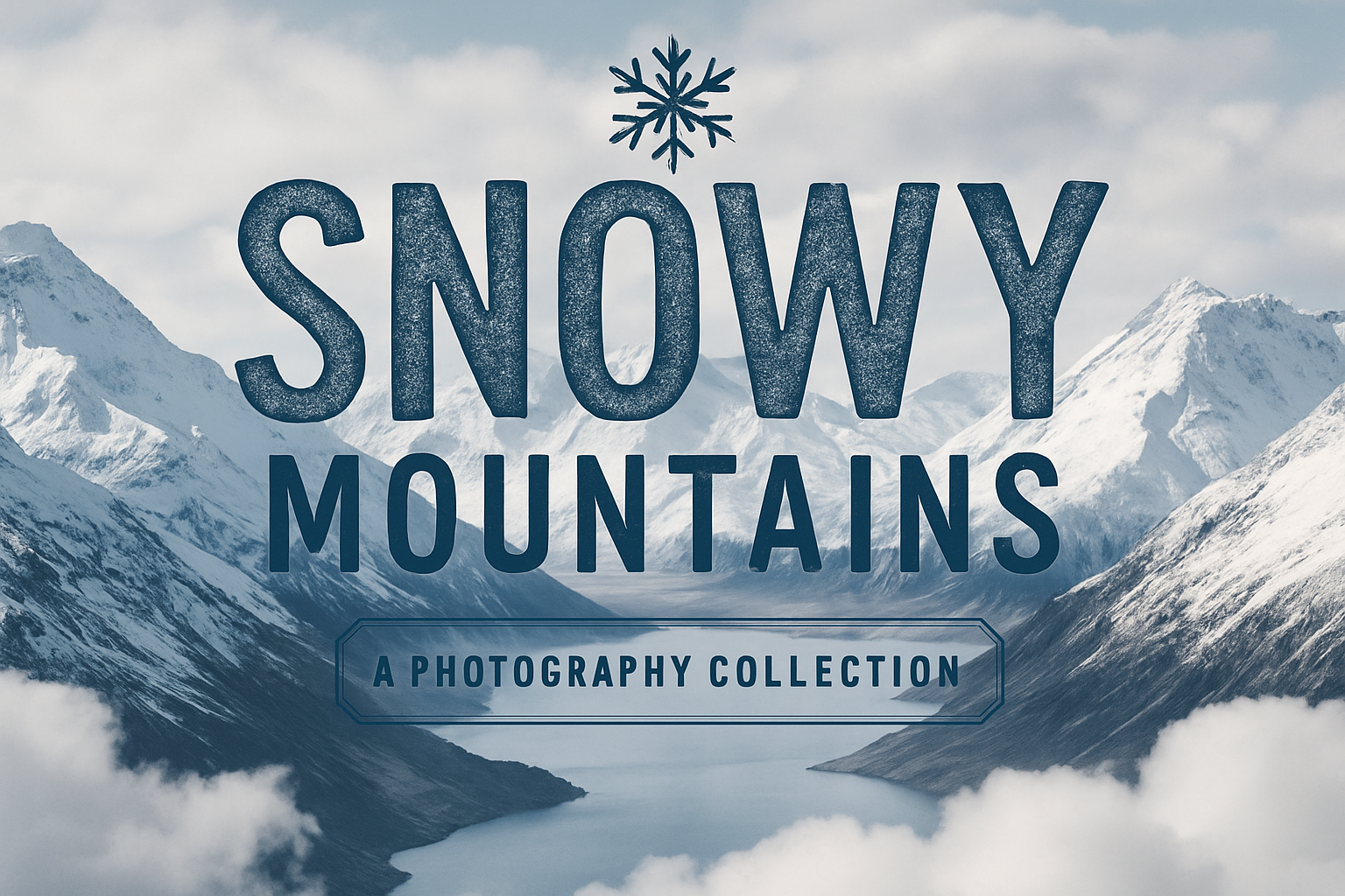 Visually appealing banner showcasing a snowy mountain landscape, designed to promote a photography collection. The serene color palette and bold typography create an inviting atmosphere for nature enthusiasts.