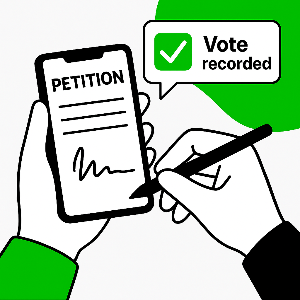/Collection: /by davooda/Type: PNG/Minimalist illustration depicting a person signing a digital petition on a smartphone, emphasizing civic engagement and digital activism. Ideal for social media or informational campaigns.