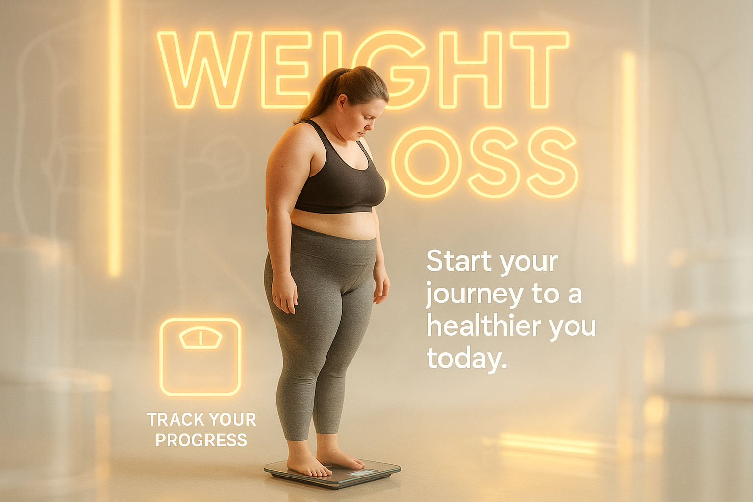 Engaging social media post showcasing a woman weighing herself, designed to inspire individuals on their weight loss journey. The modern style incorporates bright neon typography and a clean layout.