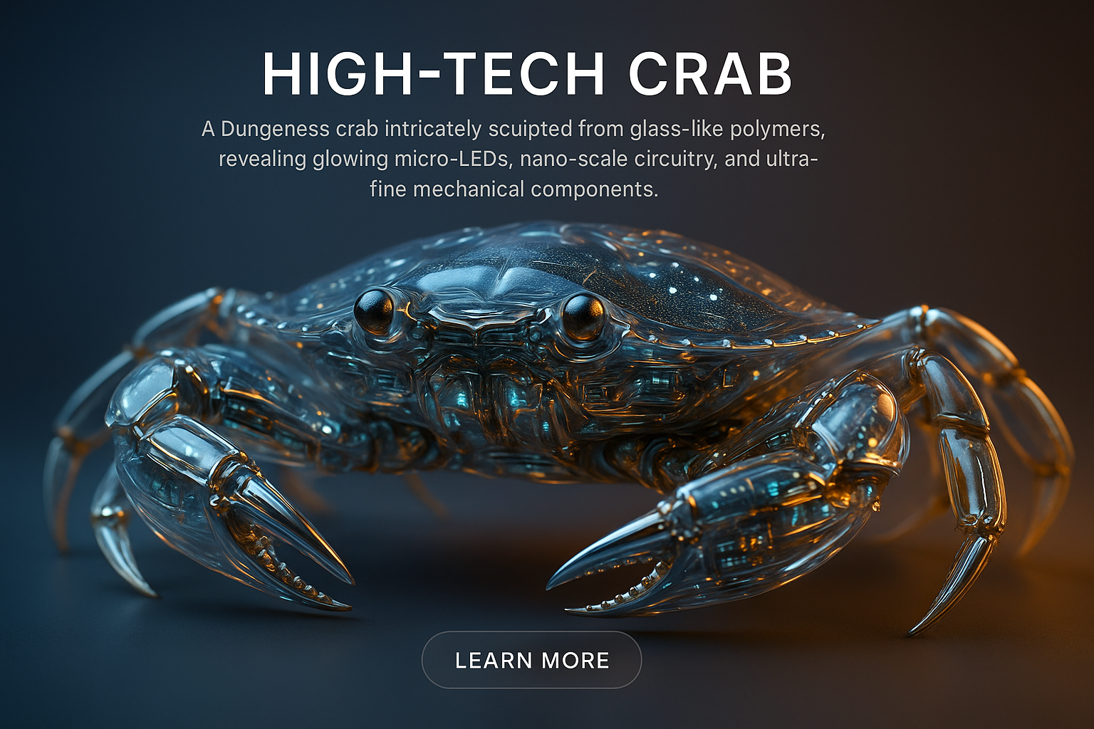 /Collection: /by davooda/Type: PNG/This image features a hyperrealistic Dungeness crab, intricately designed with glass-like polymers and glowing internal components, showcasing a futuristic aesthetic.