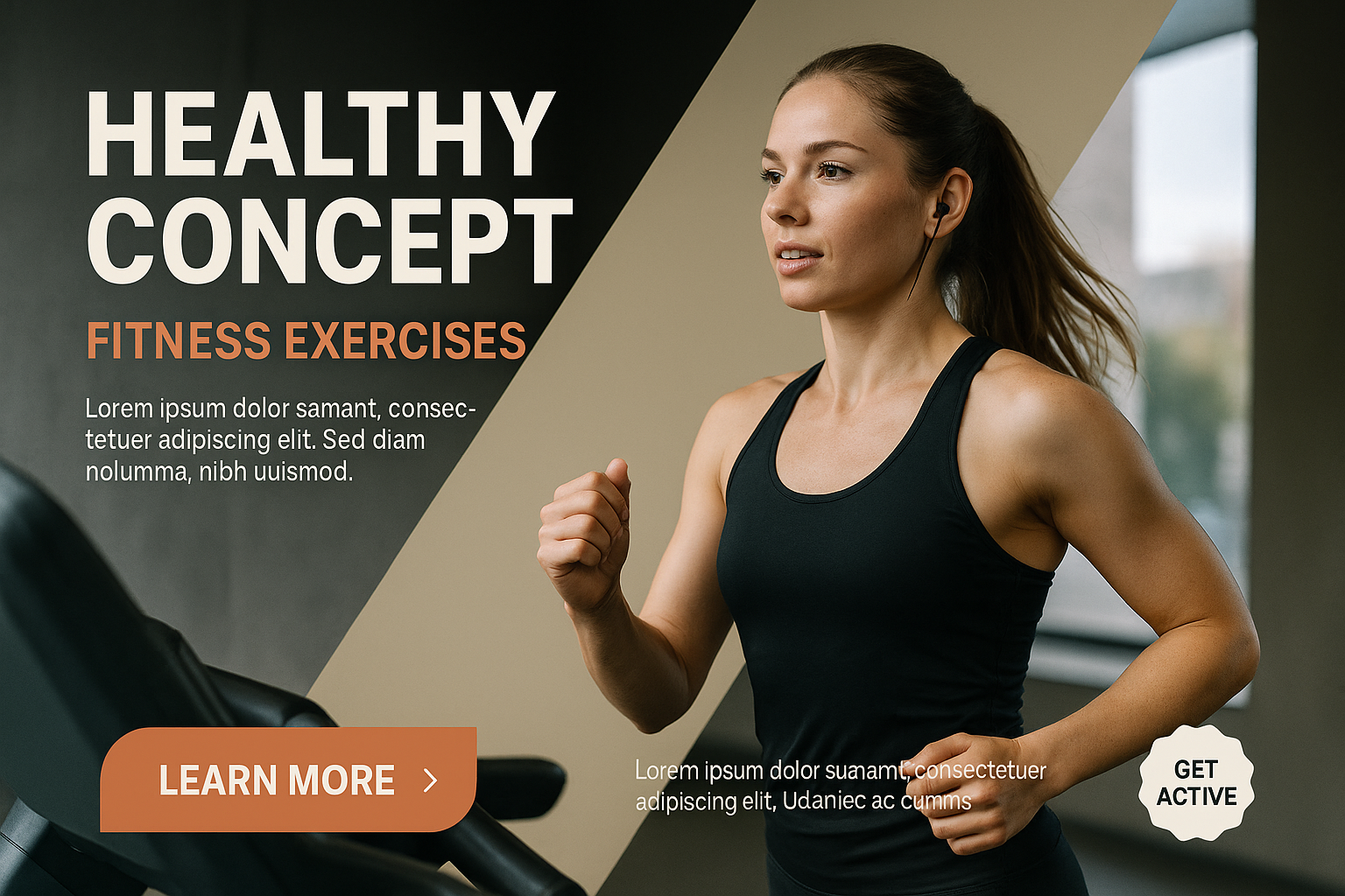 /Collection: /by davooda/Type: PNG/A focused woman engages in a workout on a treadmill in a gym, showcasing determination and fitness. The design includes an eye-catching layout with vibrant colors and interactive elements.