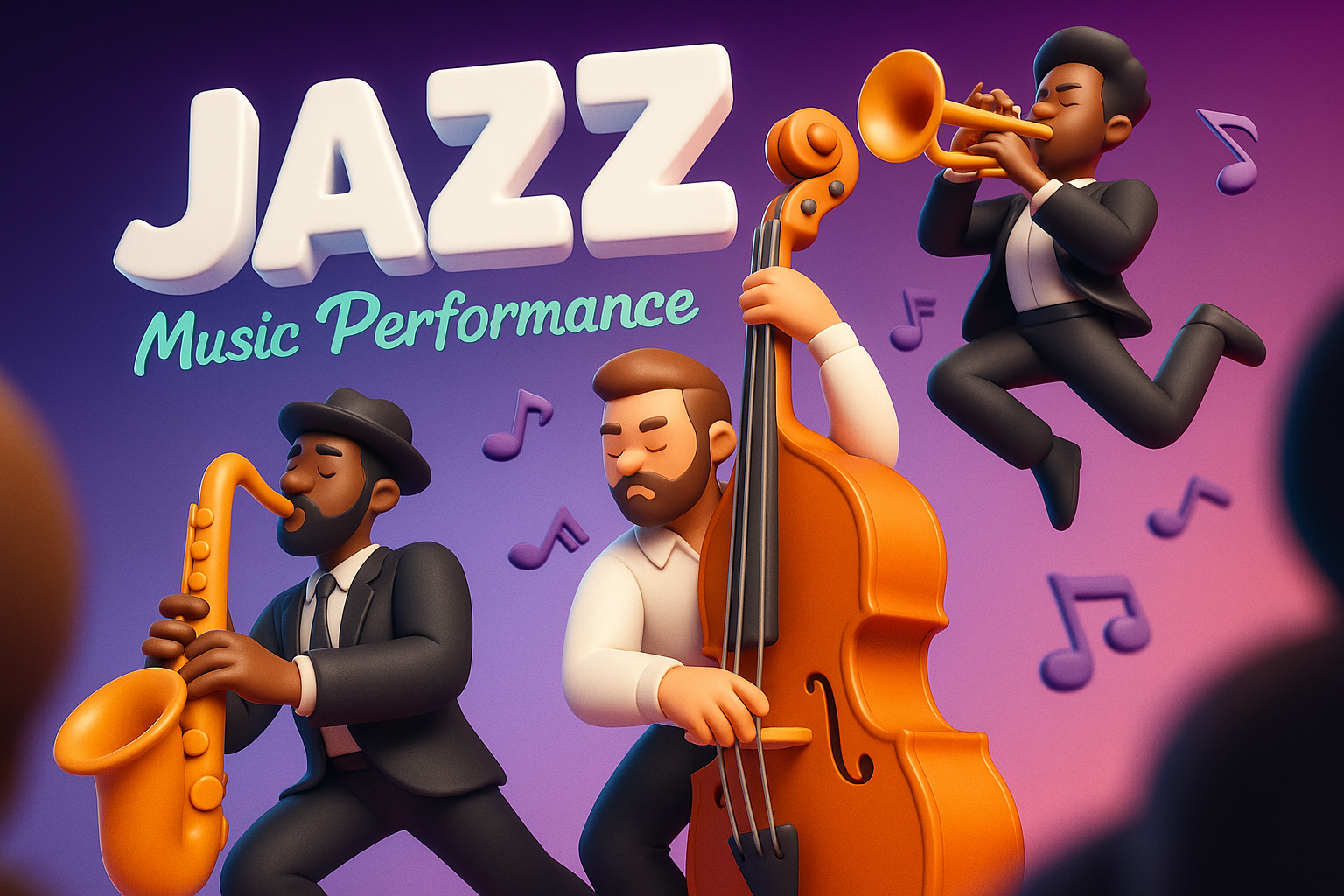 Dynamic 3D Jazz Performance Illustration with Bold Typography