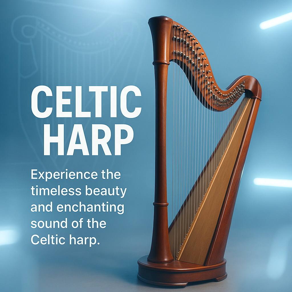 A visually striking image showcasing a Celtic harp against a softly lit backdrop. Ideal for music-related promotions or artistic presentations.